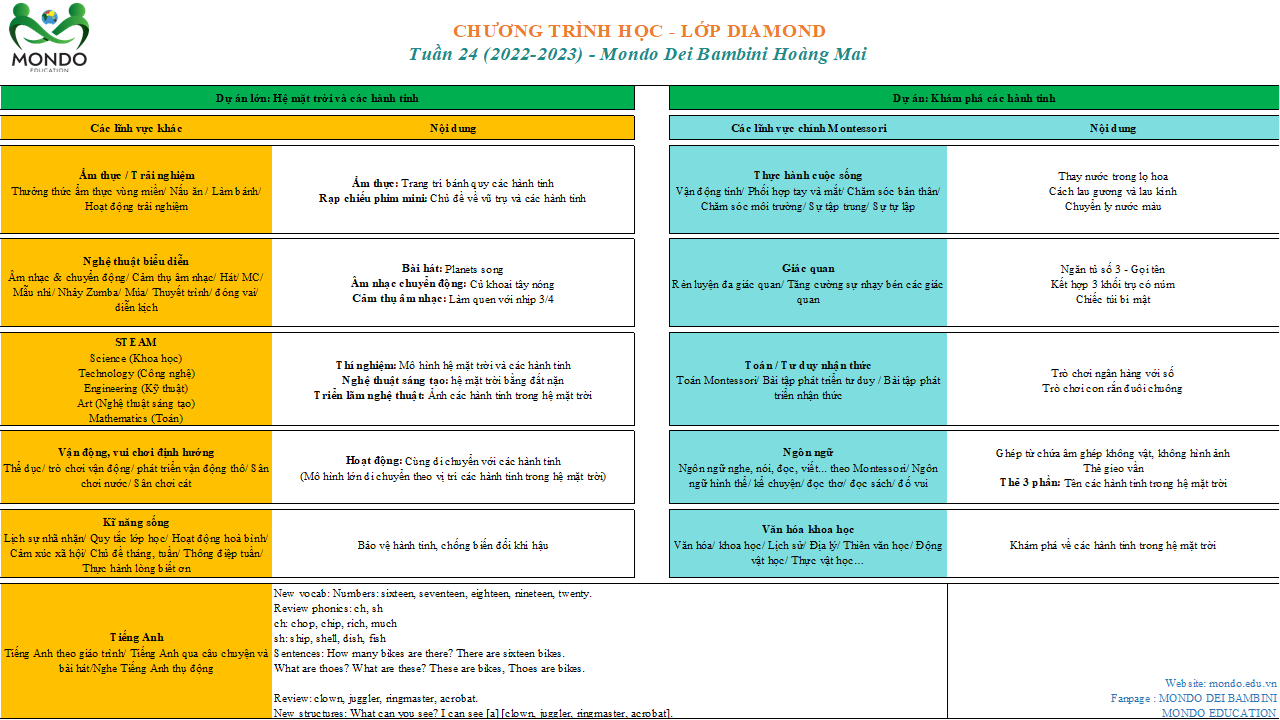 Được xây dựng bởi những chuyên gia hàng đầu về phương pháp Montessori, Mondo Dei Bambini tự hào mang đến chương trình học hiện đại, được thiết kế chủ đạo theo phương pháp Montessori nguyên bản, phát huy tối đa 6 lĩnh vực: Thực hành cuộc sống, Giác quan, Ngôn ngữ, Văn hóa khoa học, Âm nhạc chuyển động, được kết hợp hài hòa cùng các hoạt động STEAM, nghệ thuật sáng tạo, biểu diễn … giúp bé ĐỘC LẬP – TỰ TIN – SÁNG TẠO hướng tới công dân toàn diện tương lai